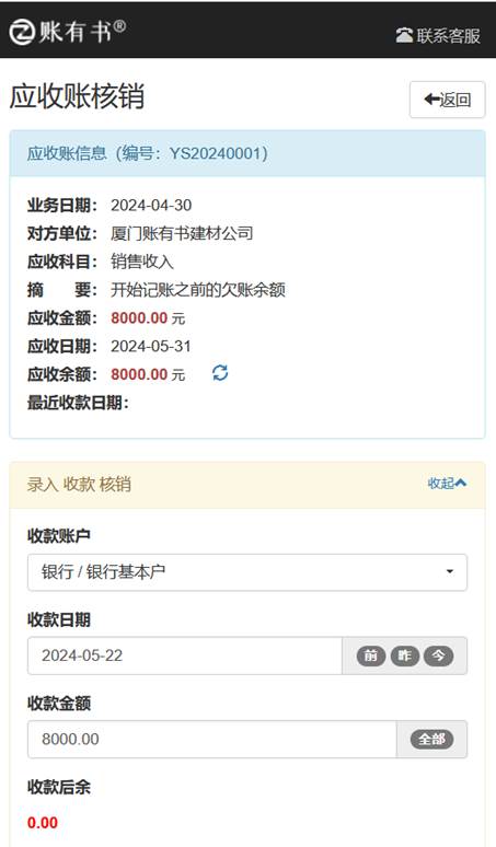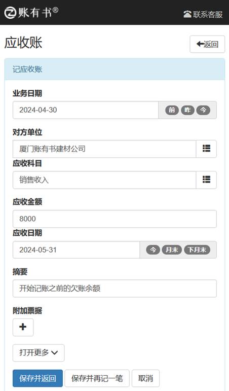 4)經過跟客戶確認,截止到2024年5月1日零時,客戶“廈門賬有書建材公司”還欠我們8000元,5月底給我們付款;