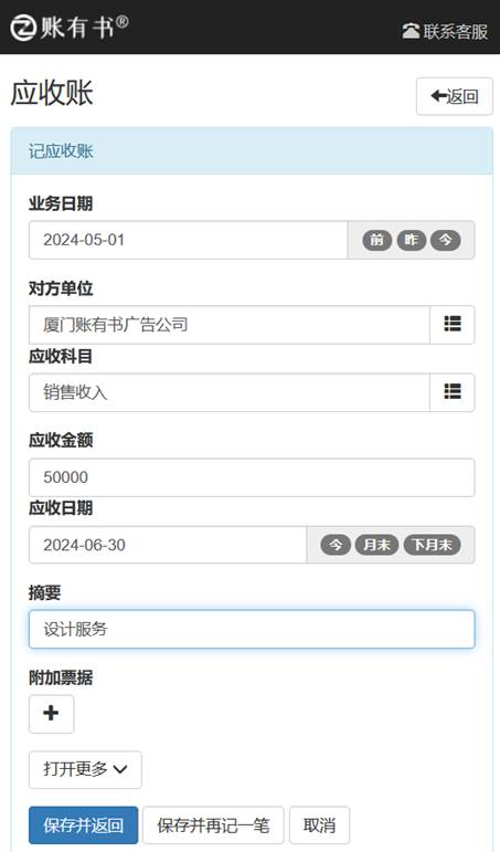 5)2024年5月1日下午,與客戶“廈門賬有書廣告公司”簽訂合約為其提供設計服務,金額5萬,下月底完工,完工后付款;
